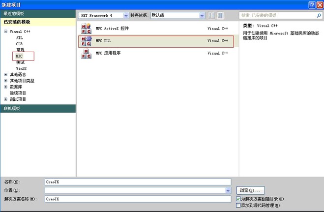 选择VC++->MFC->MFC DLL创建名称为CreoTK项目