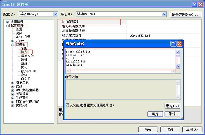 单击配置属性->连接器->常规,设置”附加库目录” ,可以通过浏览找到本地CreoToolkit的库文件目录,如下图