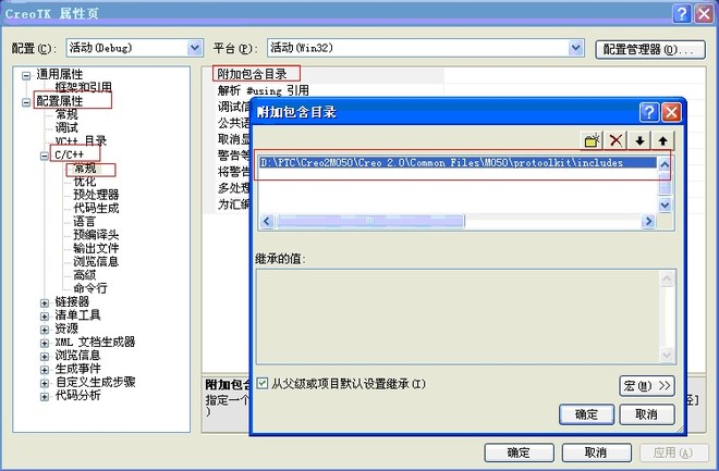单击配置属性->C/C++->常规,设置”附加包含目录”,可以通过浏览找到本地CreoToolkit的include文件目录,如下图