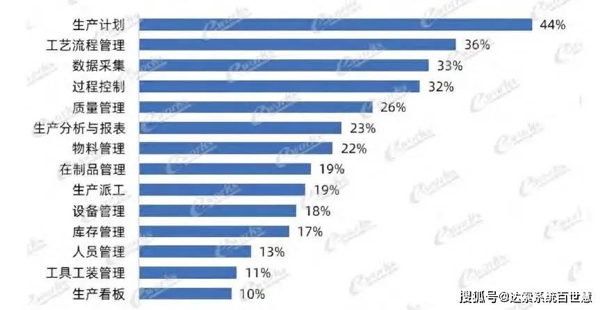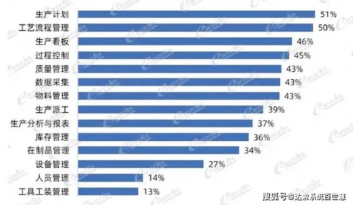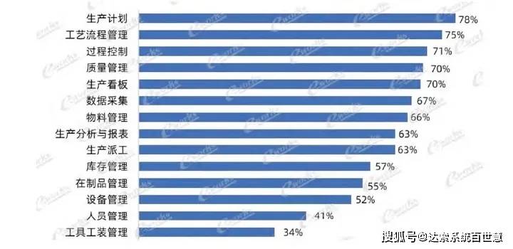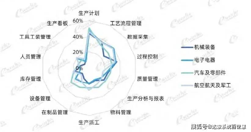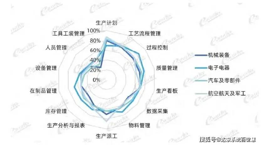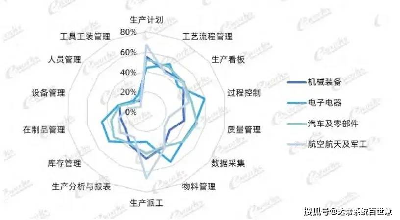 离散行业(如机械装备、电子电器、汽车及零部件、航空航天及军工)企业的生产计划、 过程控制 、生产看板、工艺流程管理等应用率都比较高,在人员管理、工具工装管理、设备管理的应用率略低。