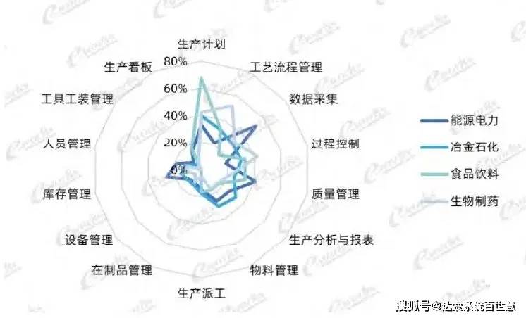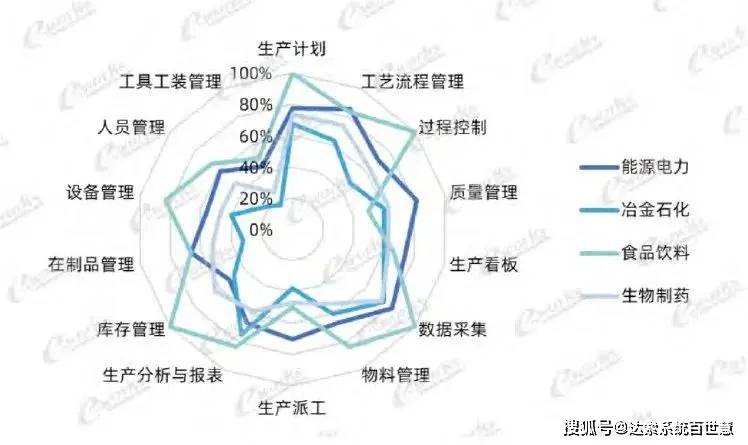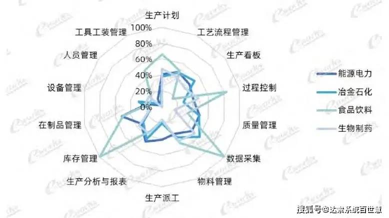 流程行业(如能源电力、冶金石化、食品饮料、生物制药)企业的数据采集、生产计划、工艺流程管理、生产分析与报表、过程控制模块应用率比较高。
