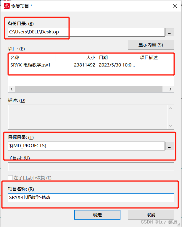 (4)在此对话框中,备份目录默认桌面,在“项目”列表中可以看到上一步备份的项目“SRYX-电柜 教学 ”,恢复的目录放在默认的“目标目录”,“项目名称”改为“SRYX-电柜教学-修改”,单机“确定”按钮,项目被恢复。