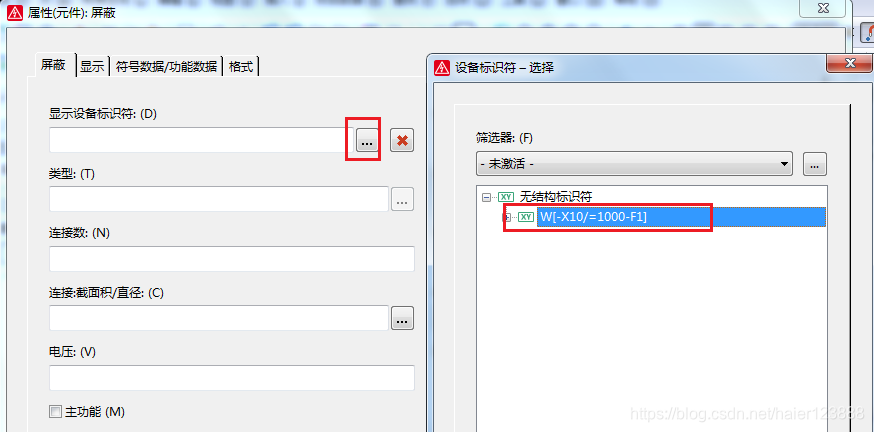 (2)当屏蔽符号系附在鼠标时,在原理图内单击鼠标左键定义起点,鼠标从右往左扫过电缆连接,再单击鼠标左键定义终点,从而激活【属性(原件):屏蔽】对话框,在【显示设备 标识符 】处手动定义电缆设备标识符或通过单击后面的扩展按钮,在【设备标识符-选择】对话框内选择电缆标识符,如下图所示。