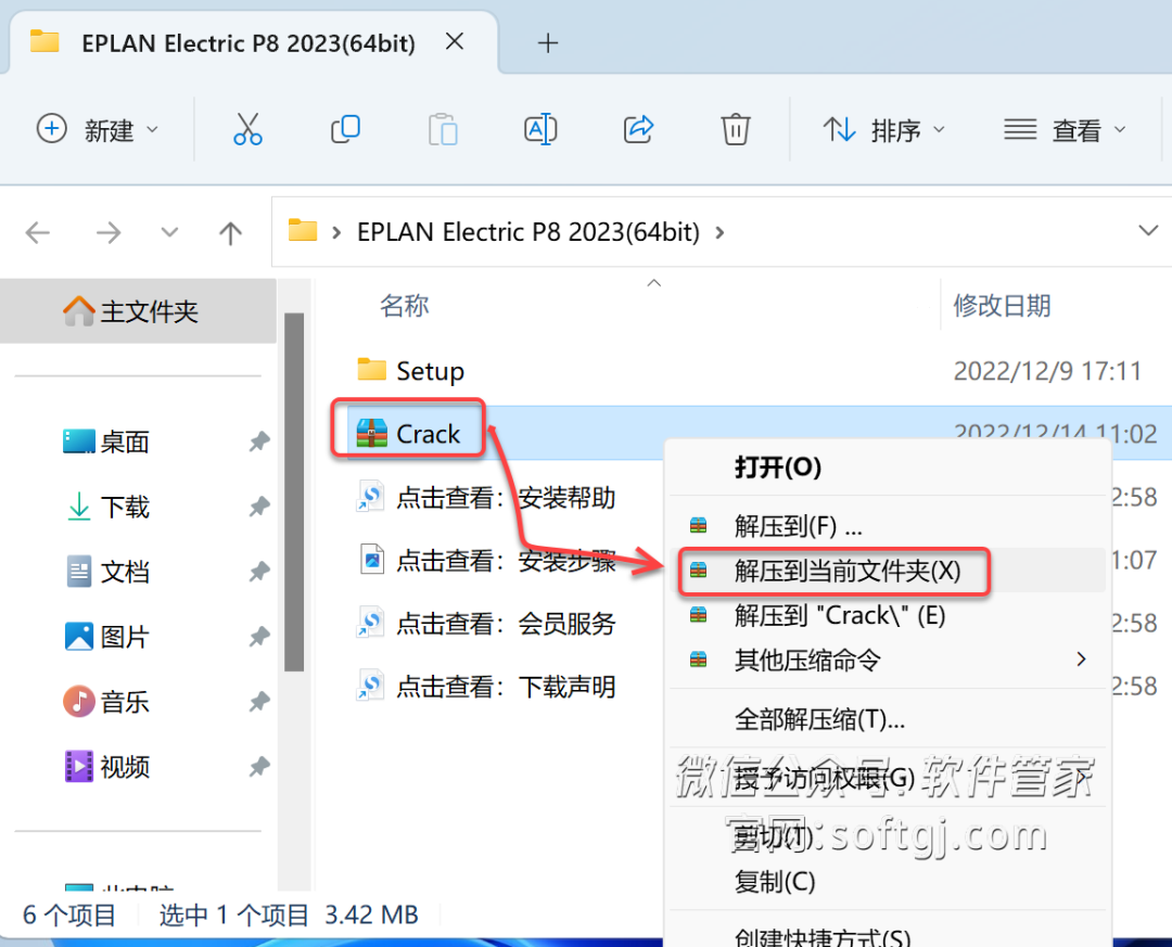 14.打开安装包解压后的【EPLAN Electric P8 2023(64bit)】文件夹,鼠标右击【Crack】选择【解压到当前文件夹】。