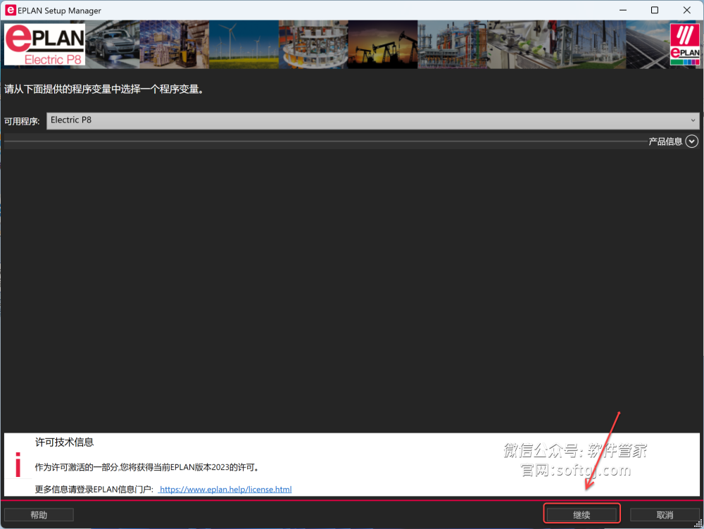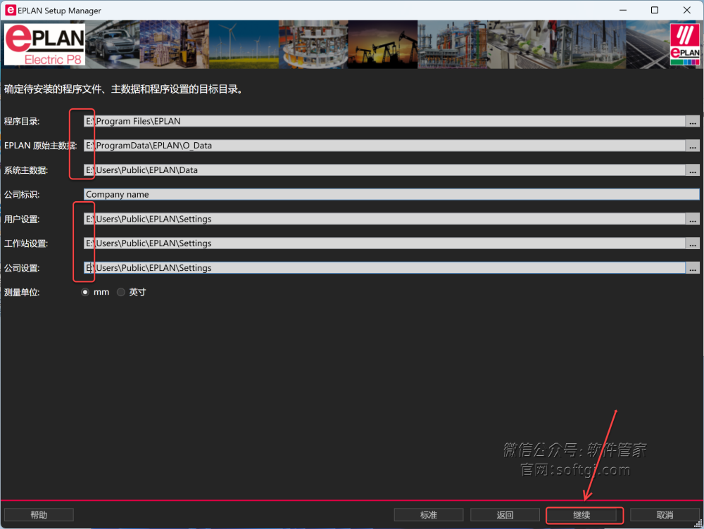 10.修改路径地址中的首字符可修改相关位置(如:将C改为E表示安装到E盘,或其他工作空间等在E盘),点击【继续】。