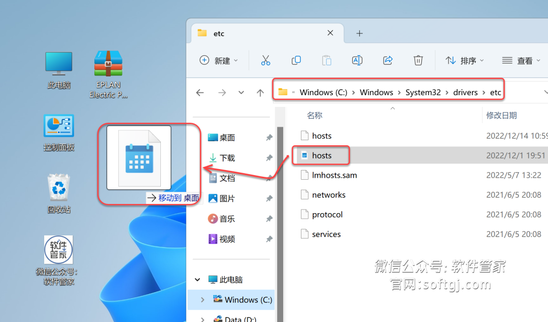 1.打开C盘路径【C:\Windows\System32\drivers\etc】,将【hosts】文件拖到电脑桌面(不关闭此路径)。