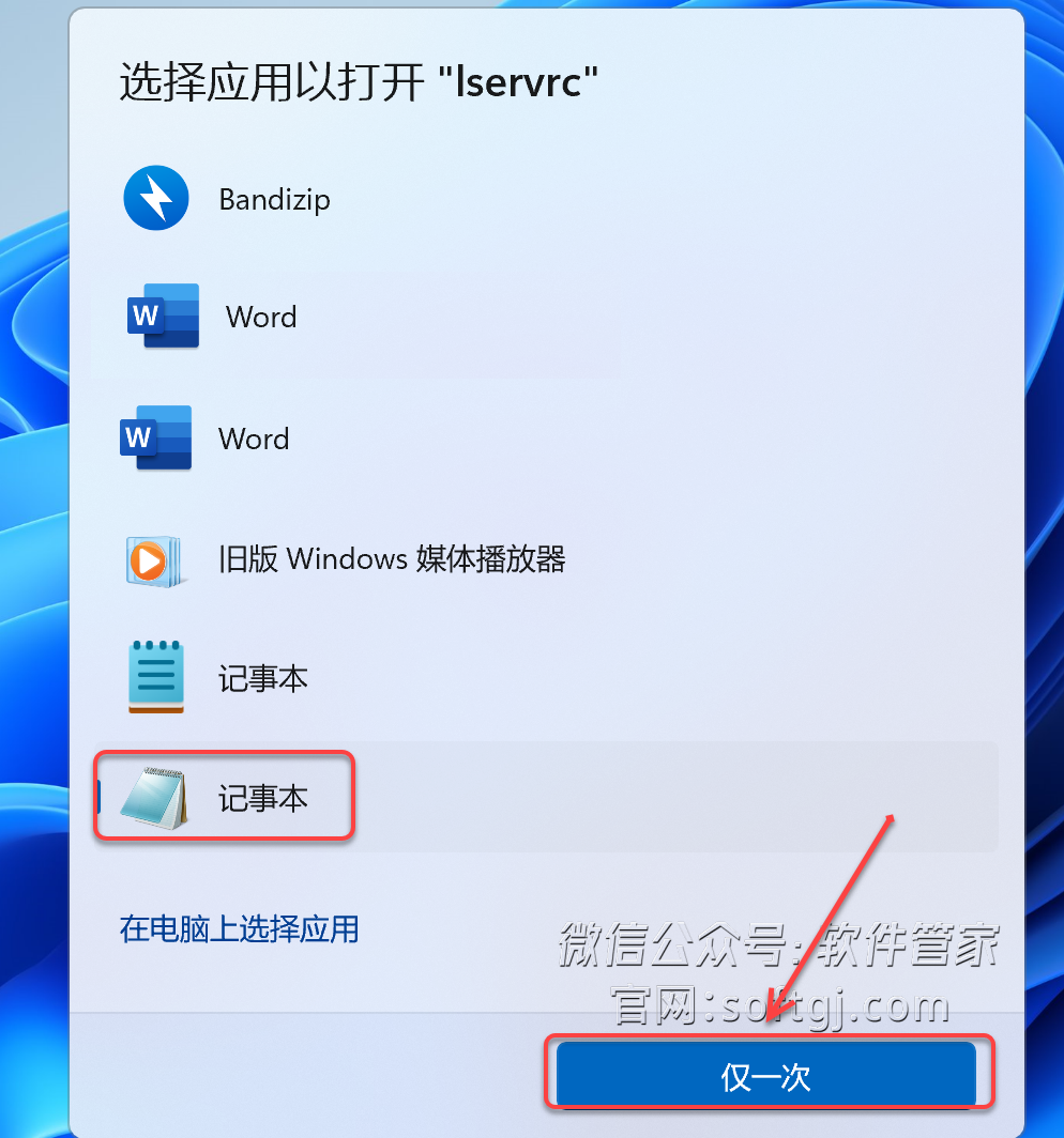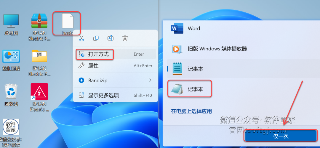 2.鼠标右击桌面【hosts】选择【打开方式】选择【记事本】,点击【仅一次】。