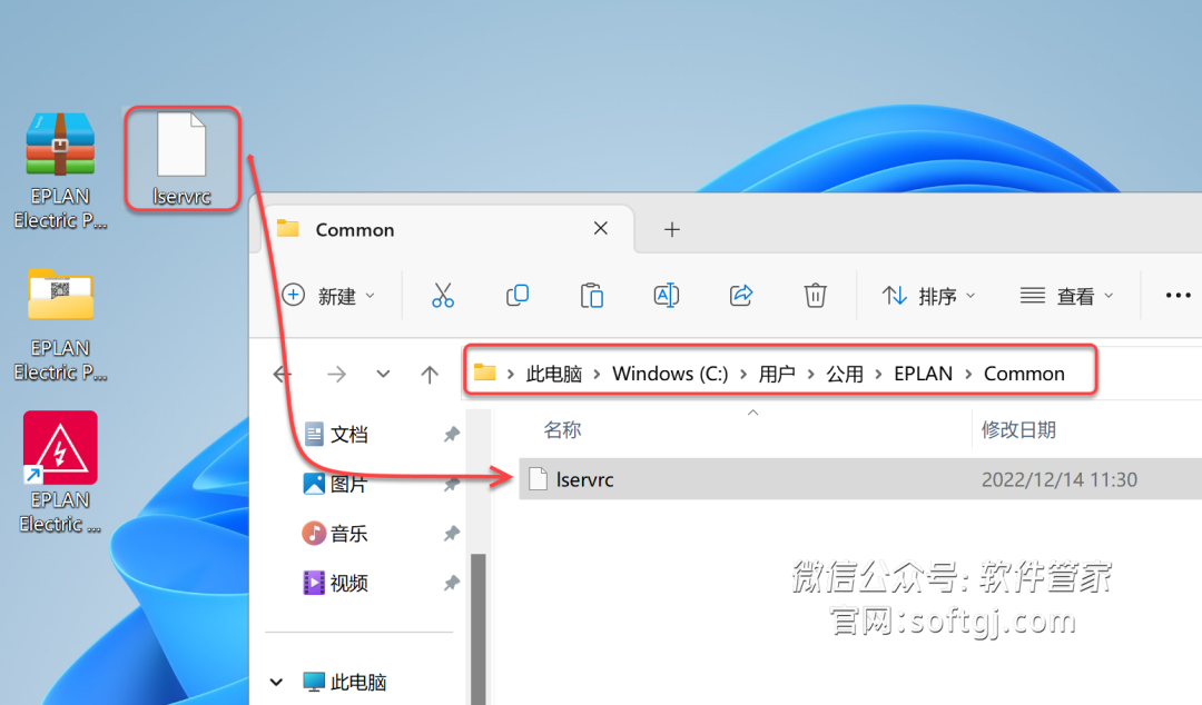 29.打开C盘路径【C:\Users或用户\Public或公用\EPLAN\Common】,将修改后的【Iservrc】拖到此位置。