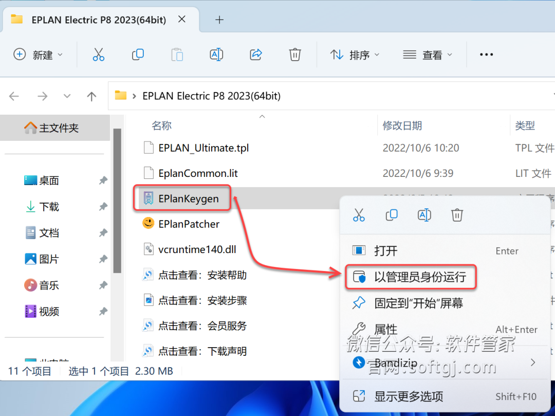 20.打开安装包解压后的【EPLAN Electric P8 2023(64bit)】文件夹,鼠标右击【EPlanKeygen】选择【以管理员身份运行】。