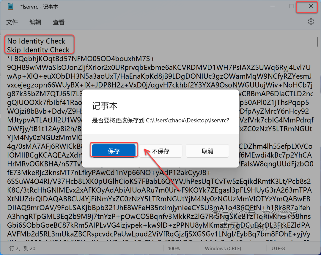 28.在打开的文档首行添加代码【No Identity Check Skip Identity Check】(注意:需要换行,如下图所示),点击右上角【X】选择【保存】。