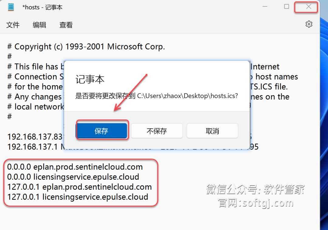 127.0.0.1 licensingservice.epulse.cloud】,点击右上角【X】选择【保存】。
