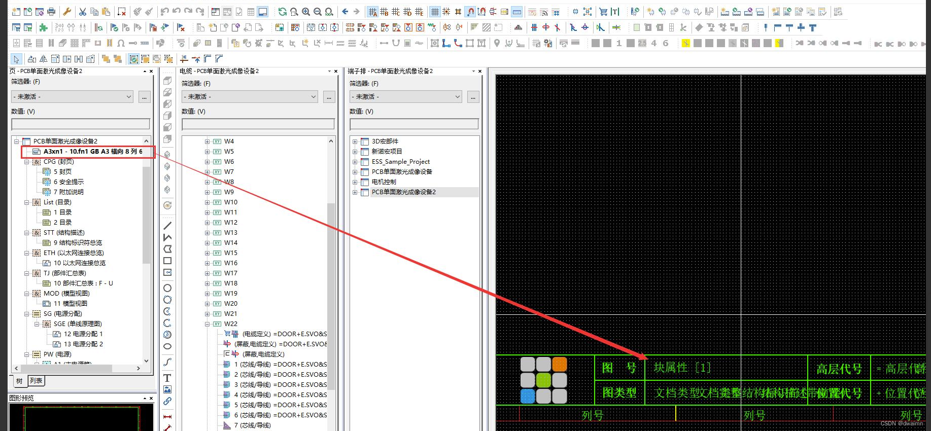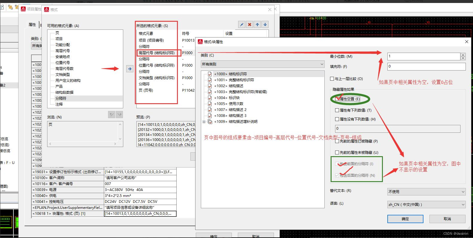 eplan项目中,有时候我们需要制定一些关于 图纸 上图号的规则,如果这些全部手动就跟CAD一样了,我们要充分发挥eplan中能批量自动操作的特性,比如我们要设计一个图号的规则。图号包括: 设备号--高层代号--位置代号--文档类型-页号,如果没有高层或位置代号就要0代替。思路:利用eplan中的块属性,首先在项目属性中添加一个块属性,然后在块属性中选择相关的变量和逻辑规则,然后在图框模板中图号的那一栏选型相应的块属性,这样图号这一栏就会自动生成相应规则的图号了,看图说话: