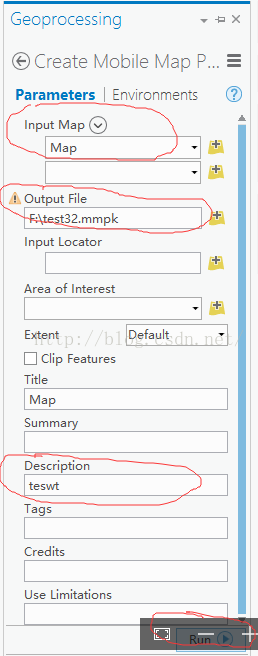 2、在Tool里搜索“Create Mobile Map Package”工具,填写inputmap、outputfile和Description即可,点击Run按钮。