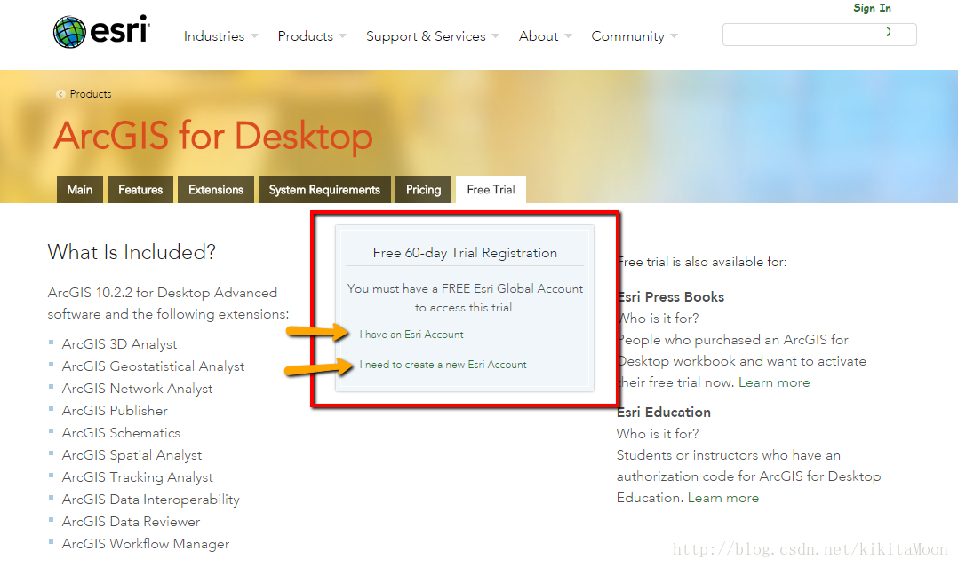 1. 打开官网试用地址:http://www.esri.com/software/arcgis/arcgis-for-desktop/free-trial