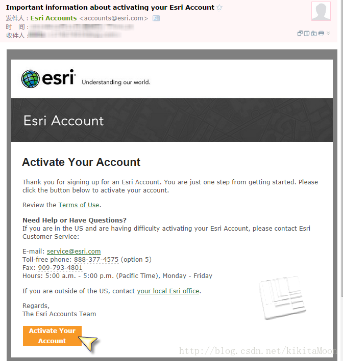 邮件的主题为:Important information about activating your Esri Account。收到的邮件这个样子,点击最下面的激活按钮,跳转到esri网站。