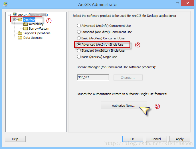 安装 ArcGIS Desktop 软件,安装完成之后,在【开始】菜单 的ArcGIS 目录中启动程序 ArcGIS Administrator。按照如下顺序找到授权按钮: