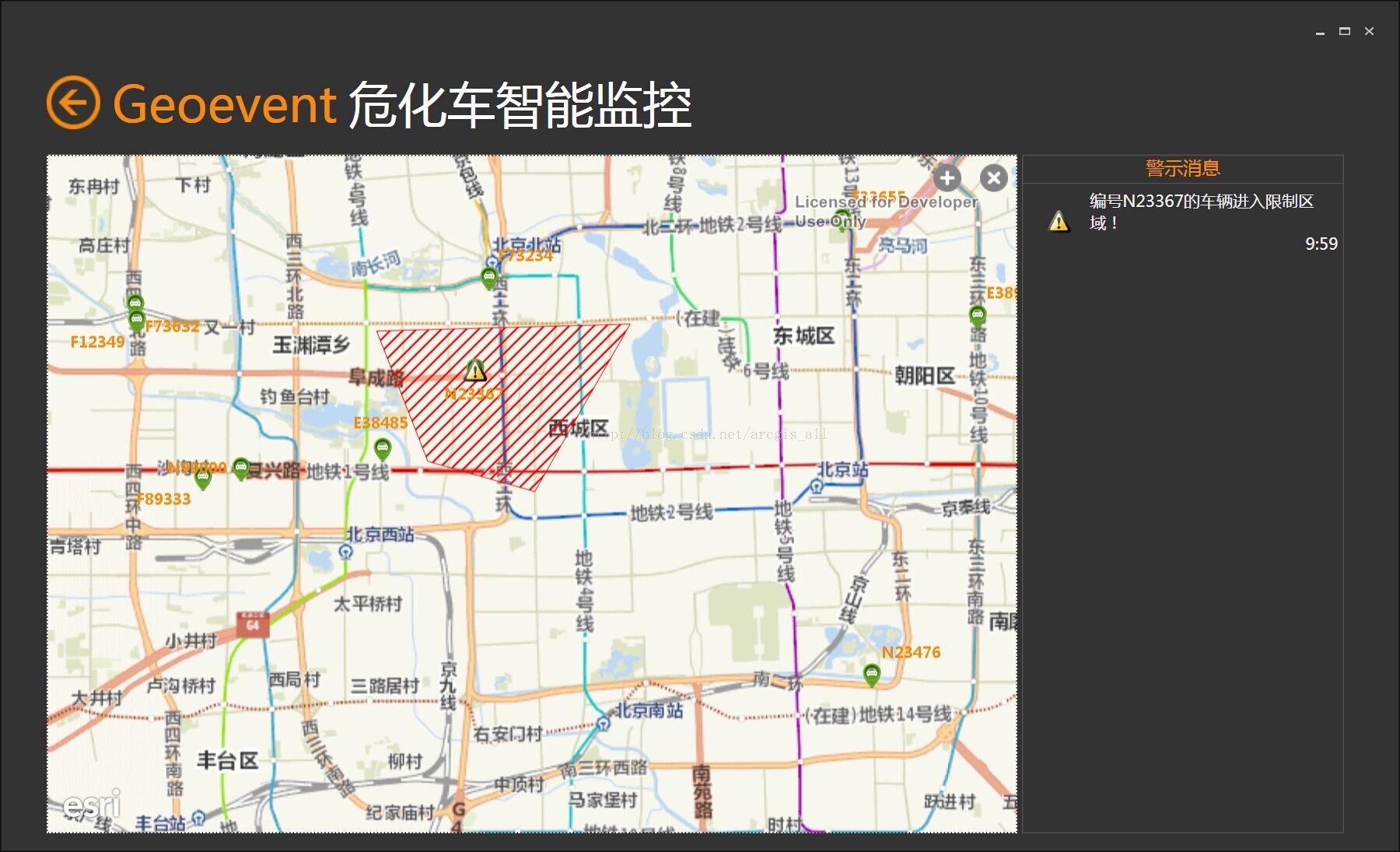 方案提供多种实时数据分析处理功能,且提供基于位置的空间数据分析处理,Demo中演示了通过动态设定的地理围栏监控危化车,防止其进入重点防护区域。