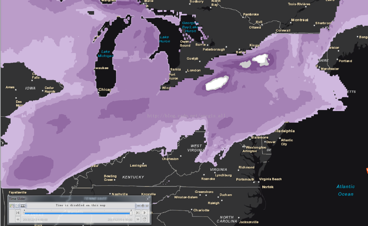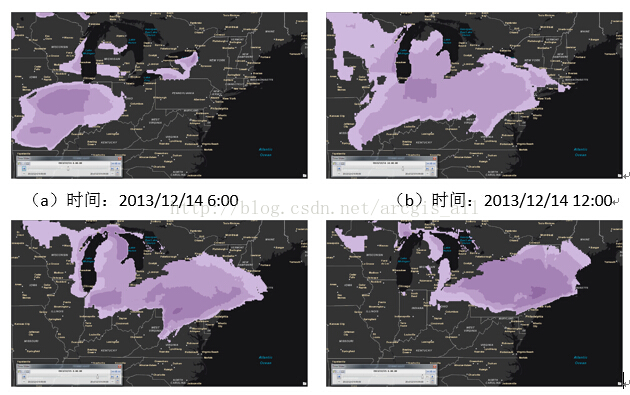 大会中展示了利用镶嵌数据管理降雪的NetCDF数据,通过对降雪量预测的数据进行分级渲染和时态回放,直观的展现了48小时的降雪变化。一大波暴雪正袭向美国东部。