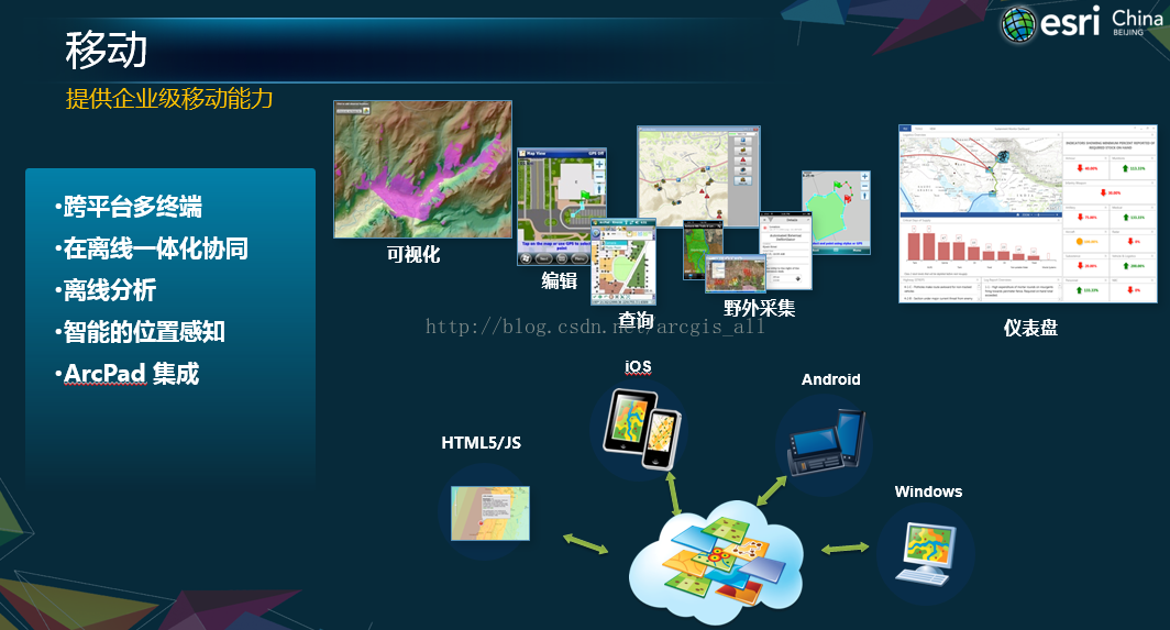 ArcGIS移动解决方案,全面支持“跨平台多终端应用”、“在离线一体化工作协同”、“强劲的离线分析”和“智能的位置感知”。