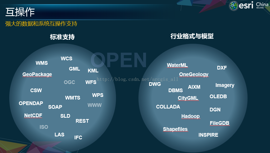 Esri还在继续改善互操作能力,以确保用户的数据和系统能与其它地理空间技术或主流的IT架构相兼容,包括支持的标准,例如OGC、WWW、ISO,还有不同领域的工业格式等。