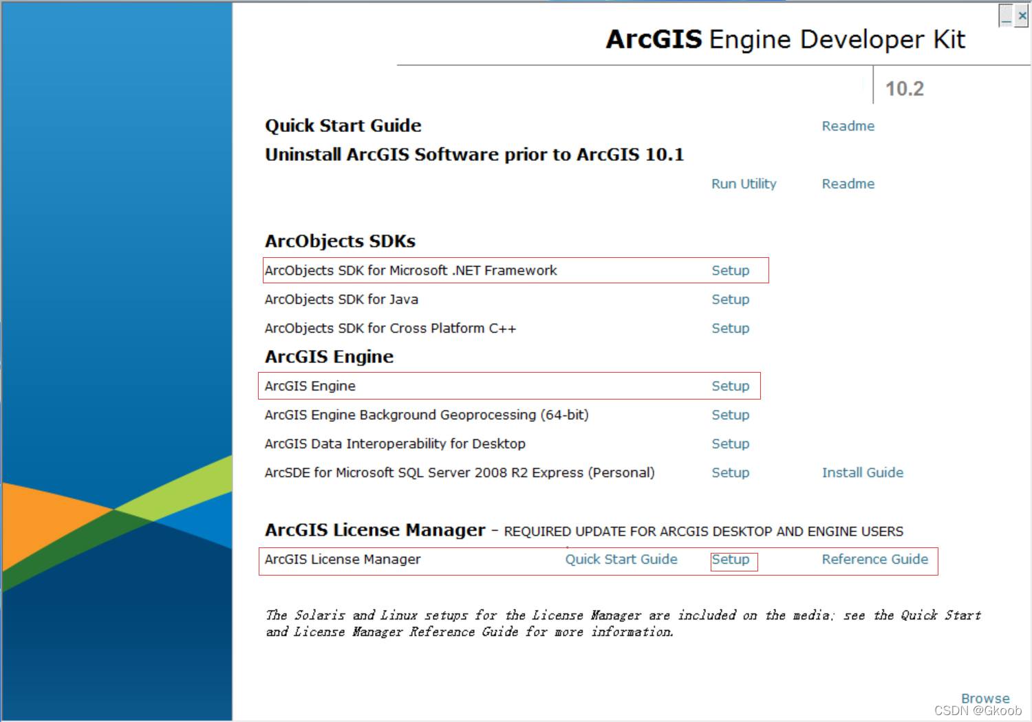 安装ArcEngine时,安装图中三项即可,顺序为ArcGIS License Manager→替换文件→ArcObjects SDKs→ArcEngine。(网上 安装教程 很多,不再赘述)
