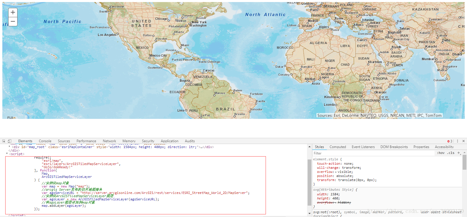 <!DOCTYPE html><html> <head> <meta charset="utf-8" /> <title>arcgis api for js入门</title> <link rel="stylesheet" href="css/esri.css" /> <script type="text/javascript" src="js/esri.js"></script> </head> <body> <div id="map"></div> <script> require([ "esri/map", "esri/layers/ArcGISTiledMapServiceLayer", "dojo/domReady!" ], function( Map, ArcGISTiledMapServiceLayer ) { //实例化map对象 var map = new Map("map"); //arcgis Server发布的切片地图服务 var agoServiceURL = "http://server.arcgisonline.com/ArcGIS/rest/services/ESRI_StreetMap_World_2D/MapServer"; //实例化ArcGISTiledMapServiceLayer图层 var agoLayer = new ArcGISTiledMapServiceLayer(agoServiceURL); //将agoLayer图层添加到map对象 map.addLayer(agoLayer); }); </script> </body> </html>4、运行index.html查看执行效果;