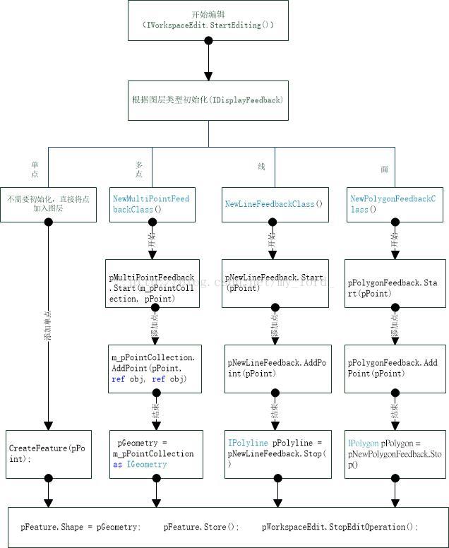 //编辑        public void NewFeatureMouseDown(int x, int y)        {            ESRI.ArcGIS.Display.INewLineFeedback pNewLineFeedback;            ESRI.ArcGIS.Display.INewMultiPointFeedback pMultiPointFeedback;            ESRI.ArcGIS.Display.INewPolygonFeedback pPolygonFeedback;            try            {                if (this.InEdit() == -1) return;                ESRI.ArcGIS.Carto.IFeatureLayer pFeatureLayer = m_pCurrentLayer as ESRI.ArcGIS.Carto.IFeatureLayer;                ESRI.ArcGIS.Carto.IActiveView pActiveView = m_pMap as ESRI.ArcGIS.Carto.IActiveView;                ESRI.ArcGIS.Geometry.IPoint pPoint = pActiveView.ScreenDisplay.DisplayTransformation.ToMapPoint(x, y);                if (!m_bInUse)                {                    this.m_pMap.ClearSelection();                    switch (pFeatureLayer.FeatureClass.ShapeType)                    {                        case (ESRI.ArcGIS.Geometry.esriGeometryType.esriGeometryPoint):                            CreateFeature(pPoint);                            break;                        case (ESRI.ArcGIS.Geometry.esriGeometryType.esriGeometryMultipoint):                            m_bInUse = true;                            this.m_pFeedback = new ESRI.ArcGIS.Display.NewMultiPointFeedbackClass();                            pMultiPointFeedback = m_pFeedback as ESRI.ArcGIS.Display.INewMultiPointFeedback;                            m_pPointCollection = new ESRI.ArcGIS.Geometry.Multipoint();                            pMultiPointFeedback.Start(m_pPointCollection, pPoint);                                                        break;                        case (ESRI.ArcGIS.Geometry.esriGeometryType.esriGeometryPolyline):                            m_bInUse = true;                            this.m_pFeedback = new ESRI.ArcGIS.Display.NewLineFeedbackClass();                            pNewLineFeedback = m_pFeedback as ESRI.ArcGIS.Display.INewLineFeedback;                            pNewLineFeedback.Start(pPoint);                            break;                        case (ESRI.ArcGIS.Geometry.esriGeometryType.esriGeometryPolygon):                            m_bInUse = true;                            this.m_pFeedback = new ESRI.ArcGIS.Display.NewPolygonFeedbackClass();                            pPolygonFeedback = m_pFeedback as ESRI.ArcGIS.Display.INewPolygonFeedback;                            pPolygonFeedback.Start(pPoint);                            break;                    }                    if (m_pFeedback != null)                        m_pFeedback.Display = pActiveView.ScreenDisplay;                }                else                {                    if (this.m_pFeedback is ESRI.ArcGIS.Display.INewMultiPointFeedback)                    {                        object obj = System.Reflection.Missing.Value;                        m_pPointCollection.AddPoint(pPoint, ref obj, ref obj);                    }                    else if (this.m_pFeedback is ESRI.ArcGIS.Display.INewLineFeedback)                    {                        pNewLineFeedback = this.m_pFeedback as ESRI.ArcGIS.Display.INewLineFeedback;                        pNewLineFeedback.AddPoint(pPoint);                    }                    else if (this.m_pFeedback is ESRI.ArcGIS.Display.INewPolygonFeedback)                    {                        pPolygonFeedback = this.m_pFeedback as ESRI.ArcGIS.Display.INewPolygonFeedback;                        pPolygonFeedback.AddPoint(pPoint);                    }                }            }            catch (Exception ex)            {                MessageBox.Show(ex.Message);            }        }