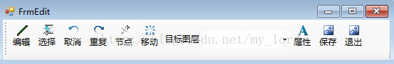工具栏的 样式 如下,包括一下几个内容:编辑、选择、取消、重复、节点、移动、目标图层(Combox列表)、属性、保存、退出。各个控件的功能介绍如下: