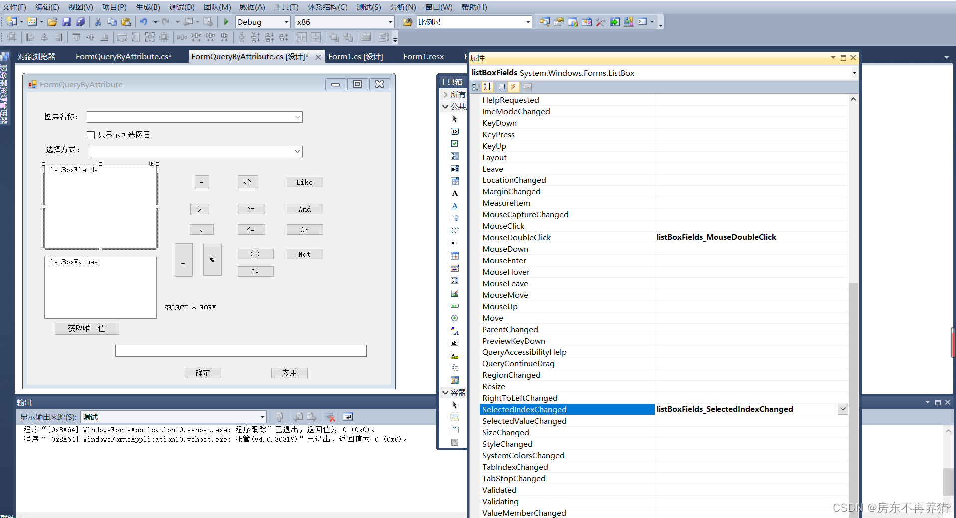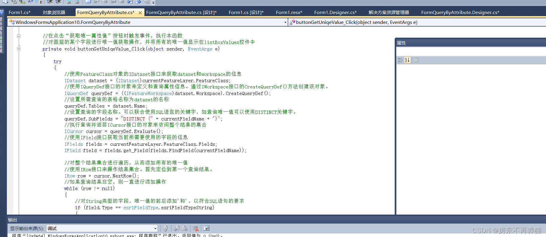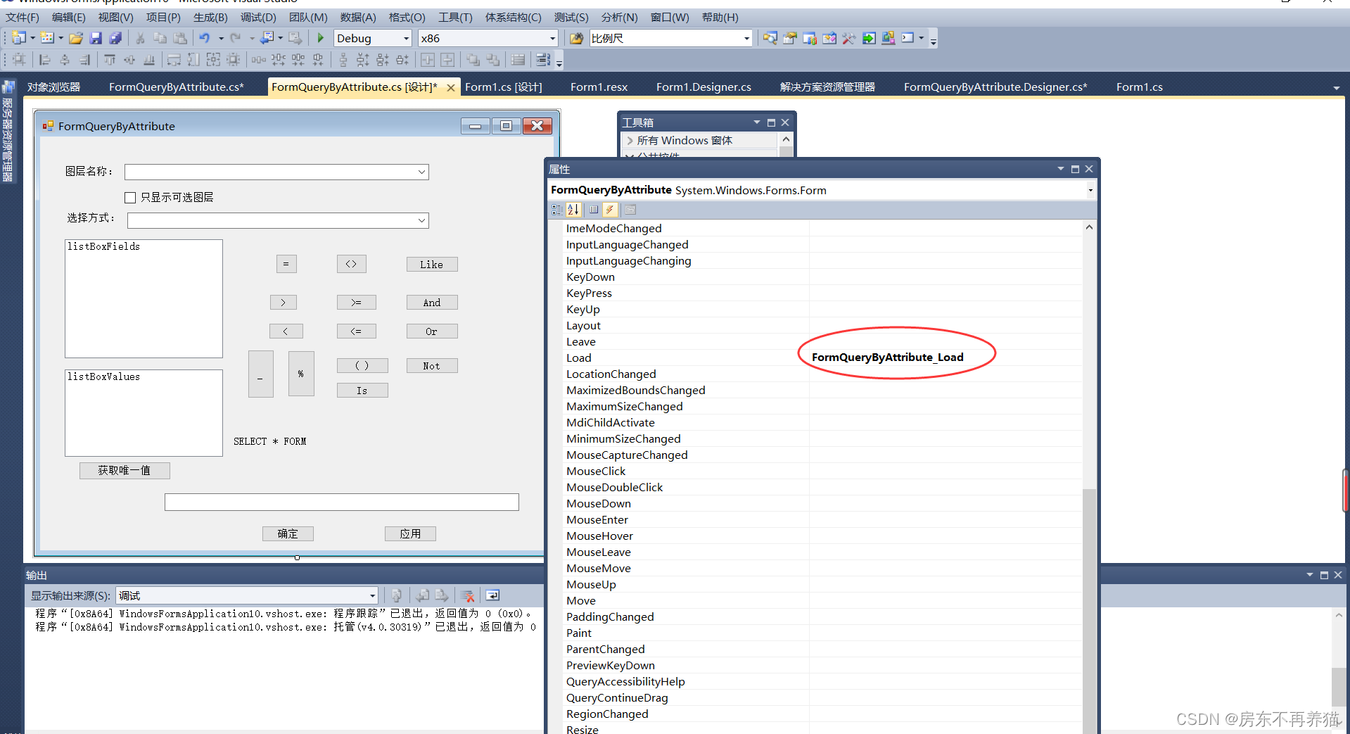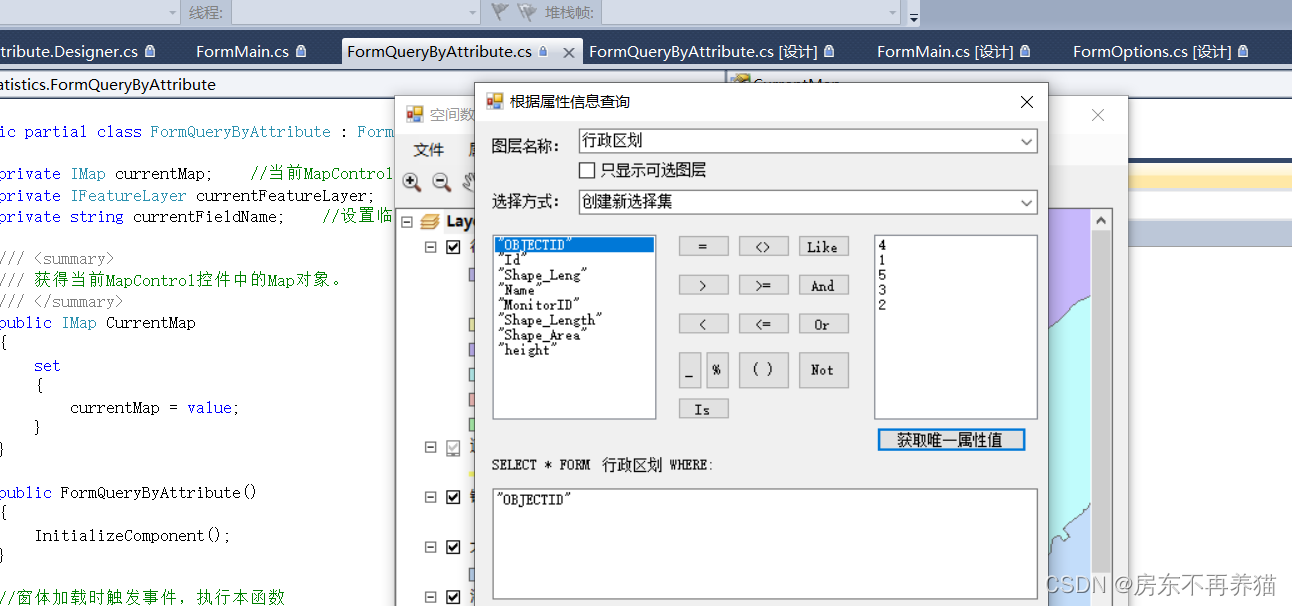 界面设计完成后注意设置相应控件的事件响应,操作的总体思路是:窗体的Load事件中加载当前地图对象中的要素图层到图层下拉列表框ComboBox 中,默认选择是第一个图层;将ComboBox中默认图层的字段读取出来放置于属性字段的ListBox里面,通过条件按钮(“=”、“>”等)构建查询的where语句传入包含筛选要素查询条件表达式(where 语句)的textbox控件中。当点击应用时执行查询。