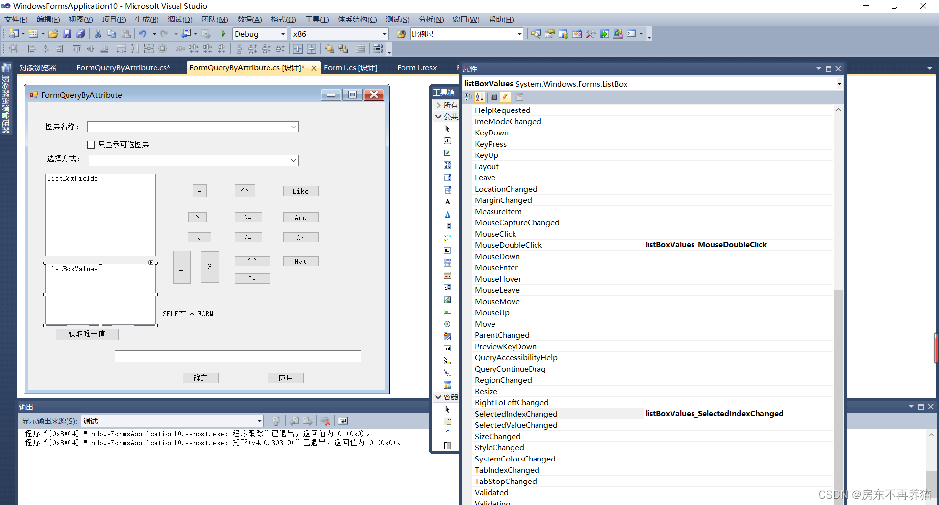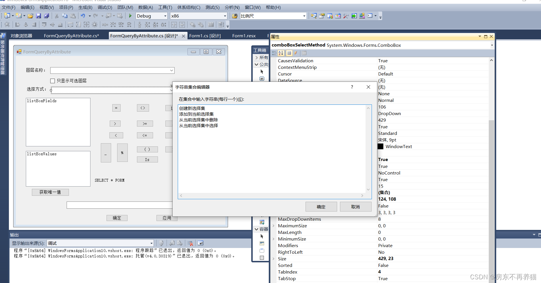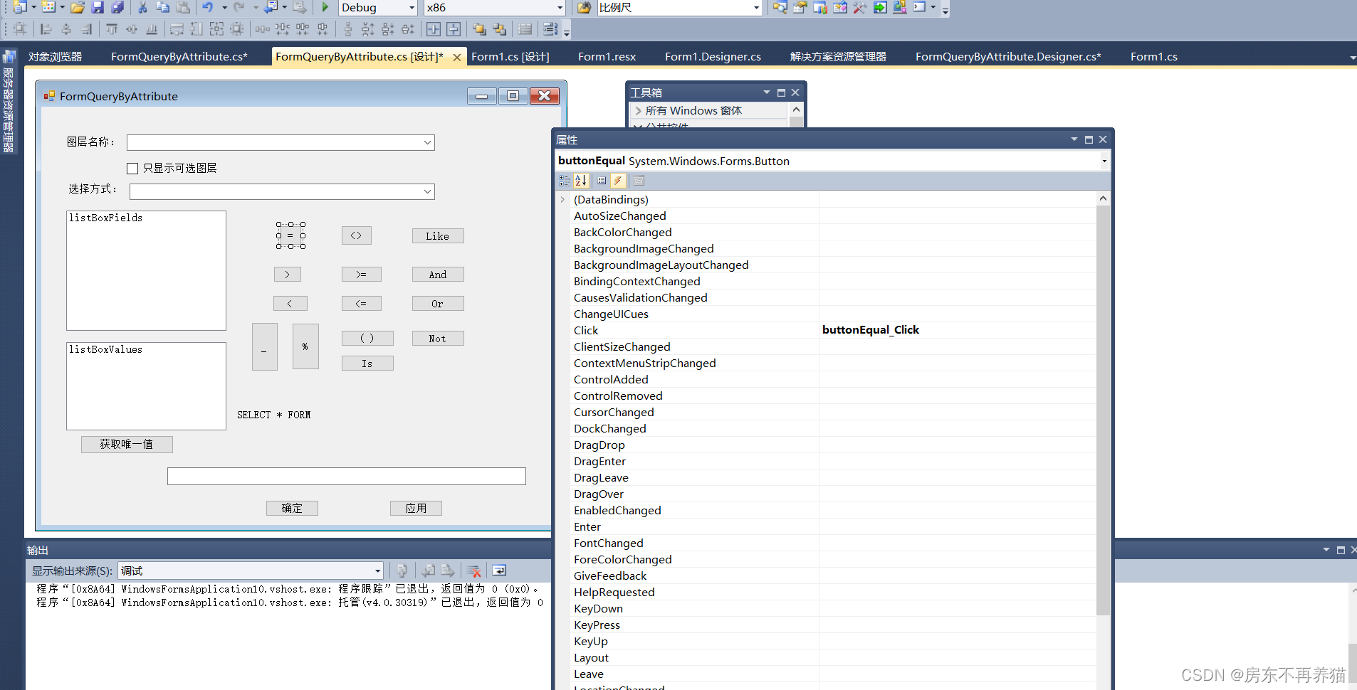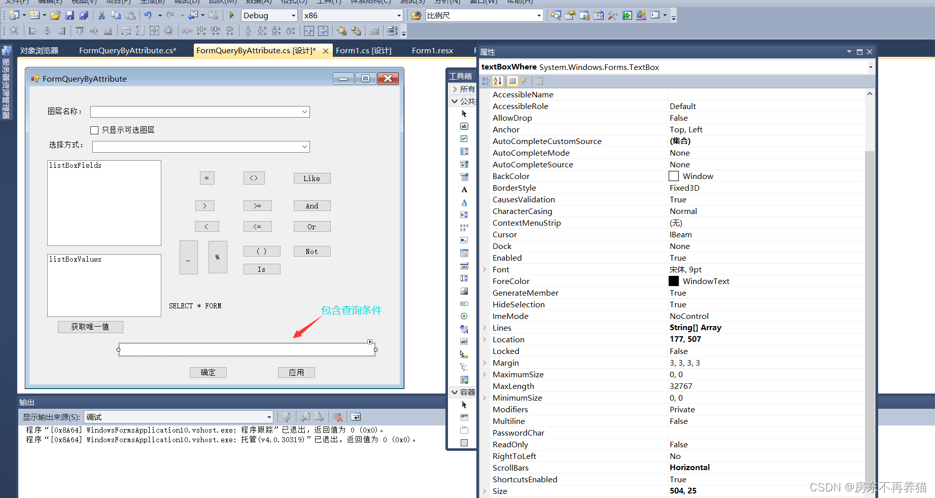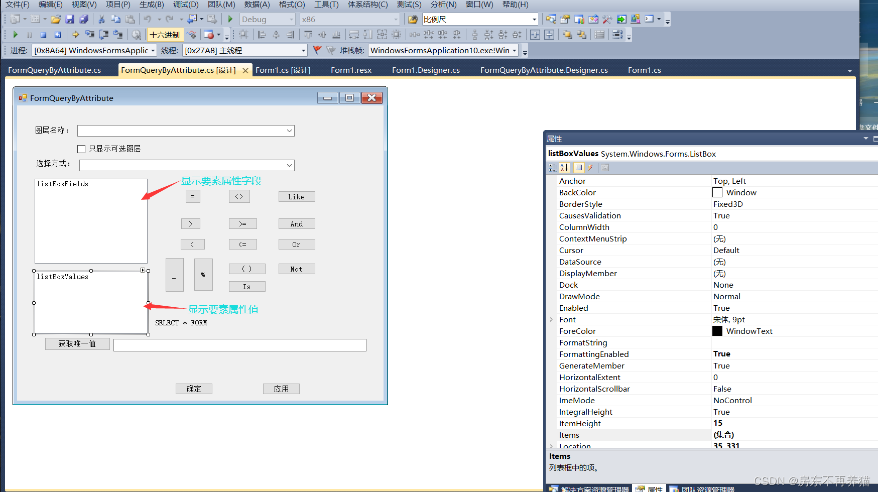 新建一个windows窗体,按需求添加相应的 控件 。按属性查询的窗体中需包含图层名称的选择框(对应工具箱中的comboBox),选择方式的选择框(选择方式包含四种,添加到字符串集合),显示图层要素属性字段的listbox,以及图层属性值的listbox(如图所示)。同时还需要有相关筛选要素条件按钮,都为button控件。最后,还需要有包含筛选要素查询条件表达式(where 语句)的textbox控件。