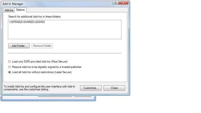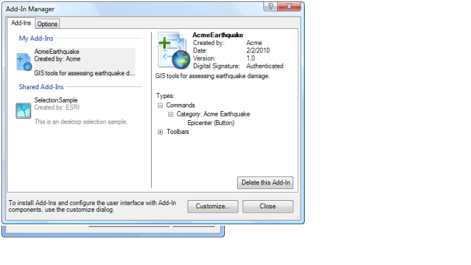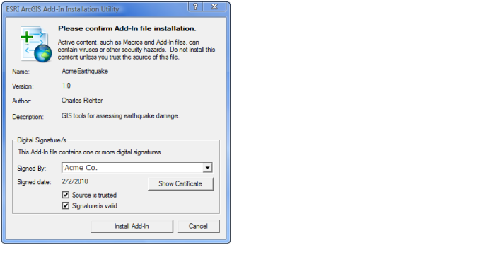 Add-ins插件能够通过 基于 web 分享,通过邮件或者浏文件系统或者网络等各种各样的资源获得。你可以在Windows Explorer里面通过双击add-in文件来安装它。当双击add-in文件的时候,ESRI系统所支持add-in文件的安装验证机制,并将其拷贝到well-known文件夹。用户可以查看插件的作者,描述,版本,数字签名信息在用户安装插件的时候。这个验证的步骤的作用是确保你的文件被拷贝到合适的位置,确保文件名字没有冲突,还要确保已经存在的add-in插件的版本不能够被老版本的插件覆盖。