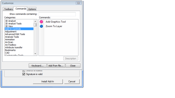 Add-ins插件也可以通过ArcGIS 桌面应用程序上自定义对话框上的“添加”文件按钮安装插件。截图如下: