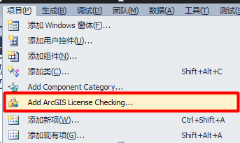6、 在Visual Studio中通过Add ArcGIS License Checking命令,运行ArcGIS LicenseInitialzer Wizard。