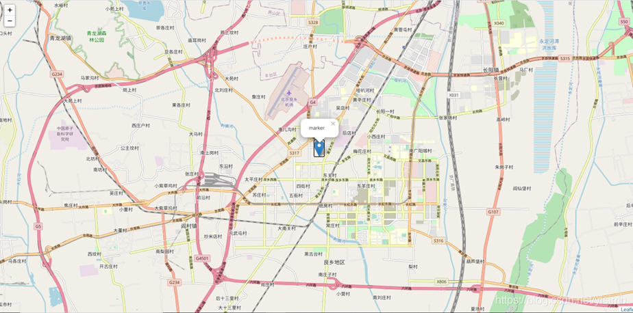 <!DOCTYPE html><html><head> <meta charset="utf-8" /> <meta name="viewport" content="width=device-width, initial-scale=1.0"> <title>Quick Start - Leaflet</title> <link rel="stylesheet" href="./css/leaflet.css"> <style> *{ margin: 0; padding: 0; } #map { height: 100vh; width: 100vw; } </style></head><body> <div id="map"></div> <script src="./js/leaflet-src.js"></script> <script> var map = L.map('map').setView([39.736861245030326, 116.13991336098002], 13); L.tileLayer('http://{s}.tile.osm.org/{z}/{x}/{y}.png').addTo(map); L.marker([39.736861245030326, 116.13991336098002]).addTo(map) .bindPopup('marker') .openPopup(); </script></body></html>