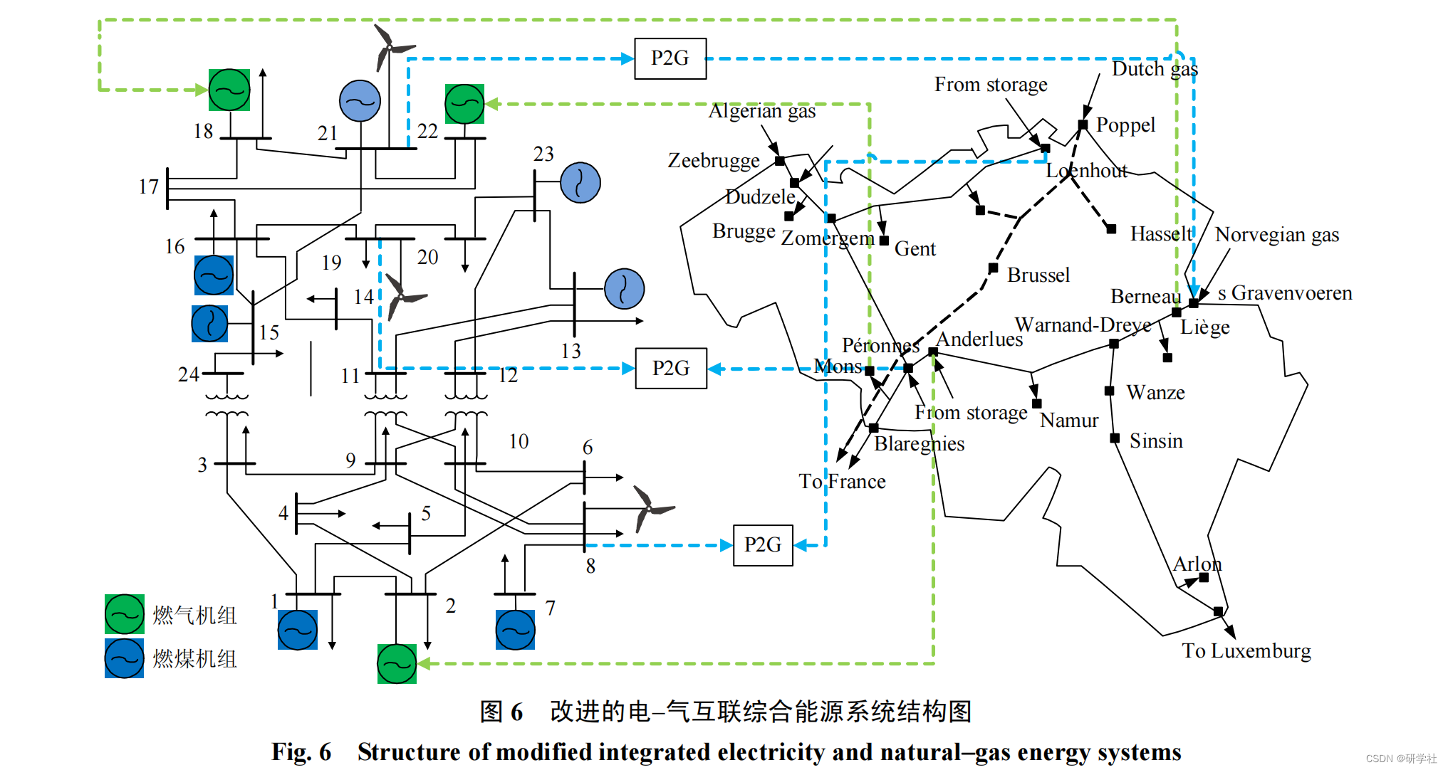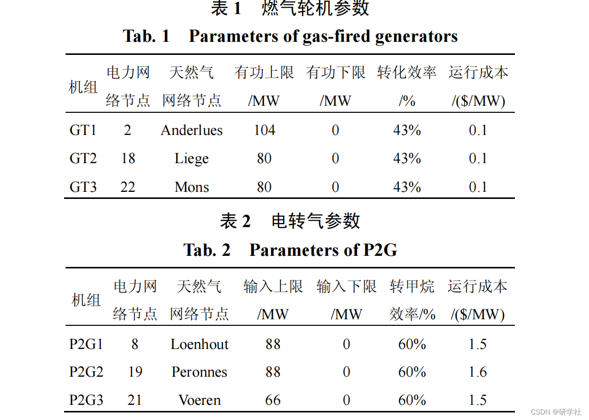 如图所示的电-气互联 综合能源系统 中,IEEE24节点系统有10台发电机组;节点2、18和22为燃气轮机,分别与天然气网络中的Anderlues、Liege和 Mons节点相连;电力节点8、19以及21各接入一台额定出力为100MW的风电机组,为最大限度消纳风电和避免天然气网络线路阻塞,电转气的输入端同样接在电力网络的8、9以及21节点,输出端则与天然气网络中的Loenhout、Peronnes和 Voeren节点相连。比利时20节点天然气系统包括21条输气 管道 ,2个加压站,2个气源点W1、W2。燃气轮机和电转气的相关参数如表1、2所示。