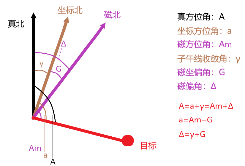 基准强弱如下:真北(经线交会之处,北极)> 坐标 北 > 磁北(磁场北极),绘制成图大致如下: