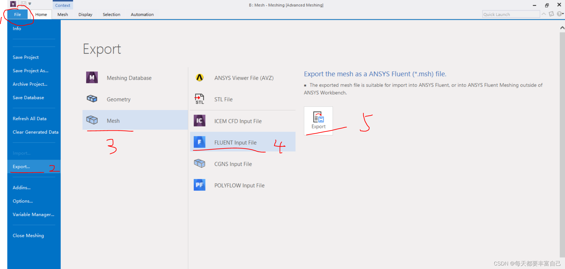 点击【File】,再找到【Export】,点击【Mesh】,选择【Fluent input file】,点击【Export】