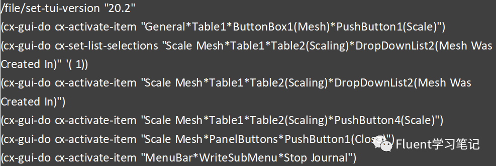 4.当case需要同样的操作时,打开fluent直接读取生成的journal文件即可。以下代码表示将模型尺寸单位由mm改为m