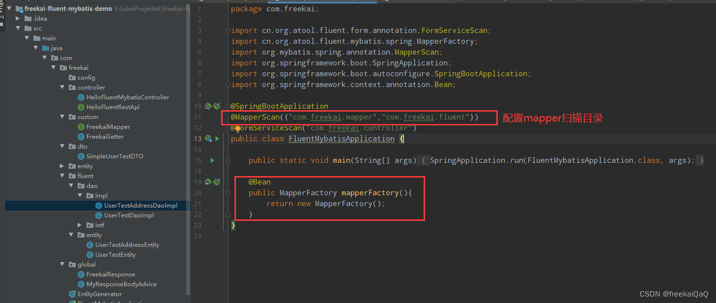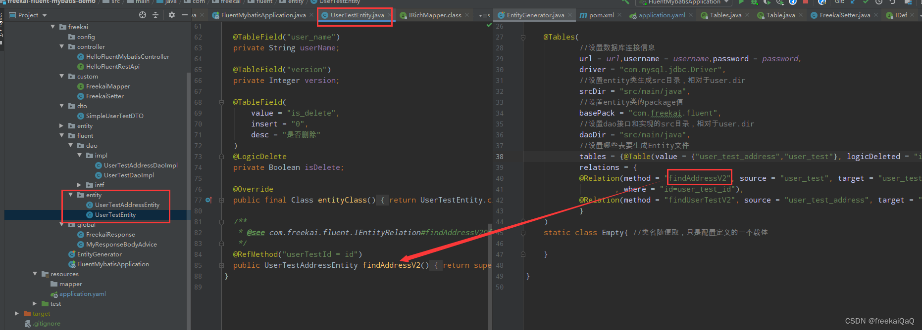 其中fluent-mybatis语法可以去官方查看对应的文档。下面一个controller是自己随便写的一些,完整的项目代码在github上。 https://github.com/freekai777/freekai-fluent-mybatis-demohttps://github.com/freekai777/freekai-fluent-mybatis-demo