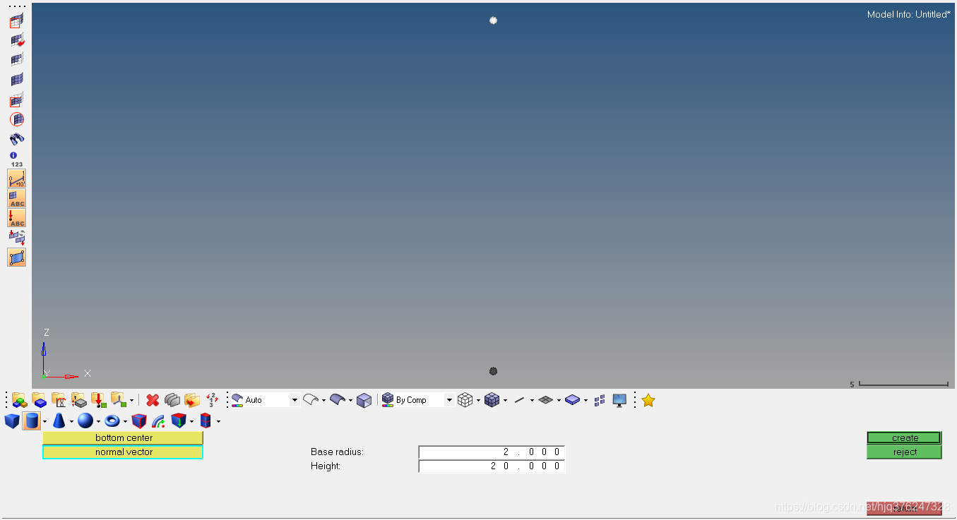先选择bottom center,然后点击定义的其中一个节点,此处定义圆柱其中一个底面,我选的下面那个;