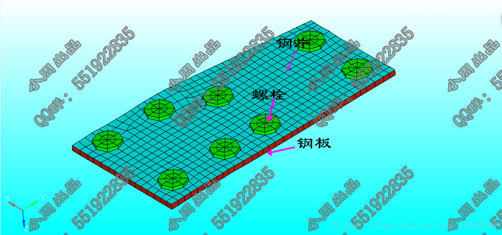 七、两块钢片中间挤压的钢板结构有限元 模型 导入ANSYS中,如图11加载预应力。