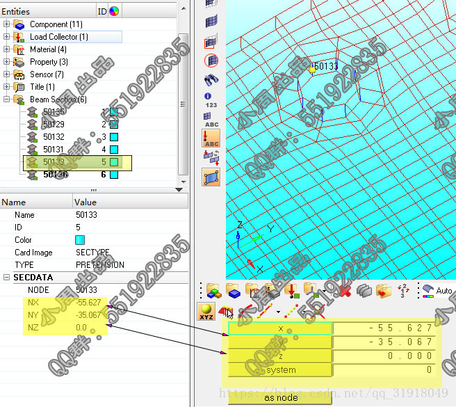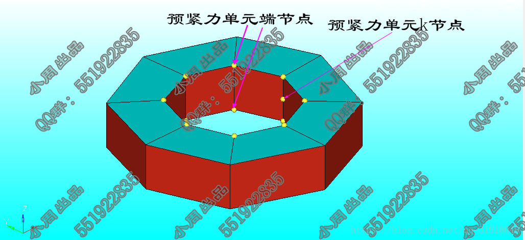 一、选出一个螺栓孔壁单元,显示出孔壁一周上下端部节点,作为预紧力单元建立的端部节点,在其中一对上下端点间建立一个节点,作为预紧力单元建立的方向节点。如图2。
