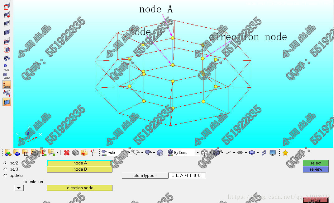 二、在panels板块1D中单击bars按钮,进入图4界面。nodeA,nodeB,direction node分别按图4依次选取,建立bar单元。其他螺栓孔,也按照此步骤建立单元完毕如图5。