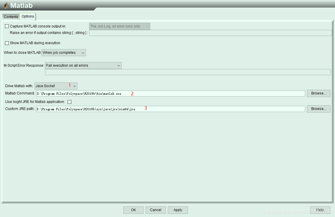 三.点击窗口中的option,选择Java Socket ;选择MATLA.Exe程序所在路径;“Use Isight JRE for Matlab application:“不要勾选;选择MATLAB自带java库路径, https://www.gofarlic.com\Program Files\Polyspace\R2019b\sys\java\jre,(其实调用的是jvm.dll 文件,但是MATLAB会自动会补充\bin\server\,所以路径只能写到\jre。jvm.dll 文件所在路径 https://www.gofarlic.com\Program Files\Polyspace\R2019b\sys\java\jre\win64\jre\bin\server\jvm.dll;);点击OK。