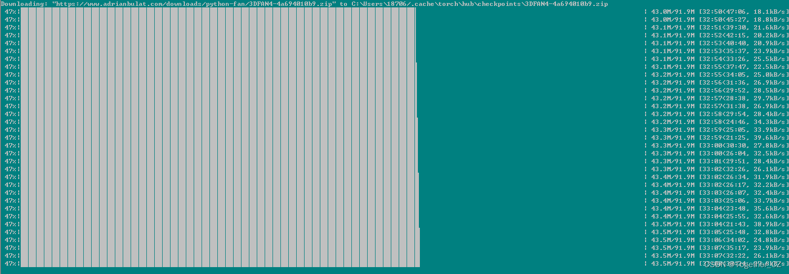 Downloading: "https://www.adrianbulat.com/downloads/python-fan/3DFAN4-4a694010b9.zip" to C:\Users\18706/.cache\torch\hub\checkpoints\3DFAN4-4a694010b9.zip 15%|███████████████▋ | 13.5M/91.9M [08:24<26:03, 52.6kB/s]