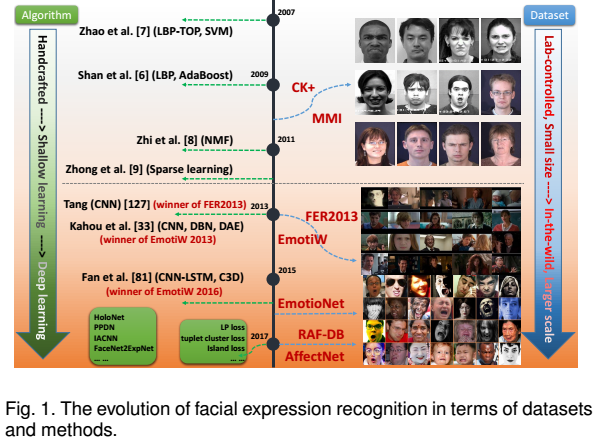 整个人脸表情识别的研究是跟随人脸识别的发展而发展的,人脸识别领域比较好的方法会同样适用于表情识别(这里主要是指静态图像FER,毕竟是个分类问题,跟人脸识别类似)。该综述从算法和 数据库 两方面调研了人脸表情识别领域的进展。在数据库方面,表情识别逐渐从传统的实验室统一控制下的小样本量数据库转移到了现实生活中的多样化大规模数据库。在算法方面,传统的手工设计特征乃至浅层学习特征也不再能很好地适应现实世界中种种与表情无关的干扰因素,例如光照变换,不同的头部姿态以及面部阻挡。于是越来越多的研究开始将深度学习技术运用到了人脸表情识别之中,来解决上述问题。