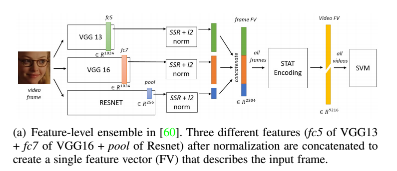 对于特征级帧聚合,主要是指针对每帧的原始数据,提取特征,联合多帧,再做处理,如有人针对这些联合帧的特征数据,计算特征向量(eigenvector),协方差矩阵,以及高维高斯模型。还有人提出STAT,即统计编码模型,联合了均值,方差,最小,最大值等。还有采用GMM进行编码生成Fisher 向量的。有兴趣的可以看论文。这里不再赘述了。