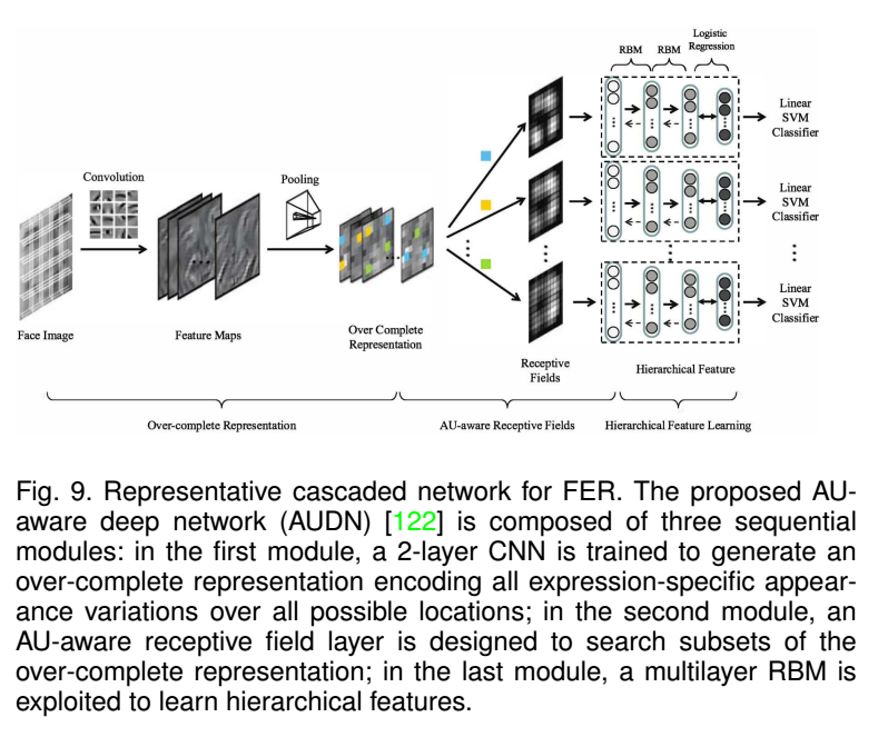 实际上就是,除了常见的输入RGB原始脸部数据给网络,还有一些手工特征,如SIFT,LBP,MBP(人脸识别之表情识别(五)--MBP+CNN),AGE(3D angle,gradient edge),NCDV,还有LBP+HOG+Gray@51点landmark生成DSAE,PCA以及裁剪出五官进行特征学习而不是整个脸部等。个人觉得这个是有道理的,纯粹脸部表情,没有必要将全部脸部数据传递进去提取特征,毕竟,网络模型的权重更新,依据脸部全部数据的话,虽然大多数特征是好的, 但谁也说不好,脸部与表情无关的数据,对表情识别的贡献多大,以及生成的特征是否有效,因为最终的输出是部分节点的激活结果。