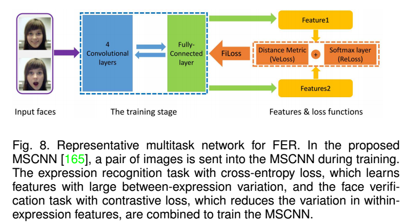 这里的多任务网络,不是指常见的检测和对齐一起做,而是表情和landmark一起、表情和人脸验证一起、以及表情和AUs分类一起。如disBM(高阶玻尔兹曼机),学习与表情有关的主要坐标以及后续的表情分类,值得注意的有SJMT解决AUs的多标签用以识别AUs,IACNN包含两种提取网络,一路用表情感知测度学习提取判别表情类别的特征,一路用身份感知测度学习提取表情中不变特征,类似的还有MSCNN,基于监督的表情识别和人脸验证一起,如下图