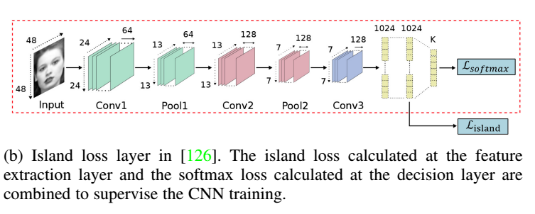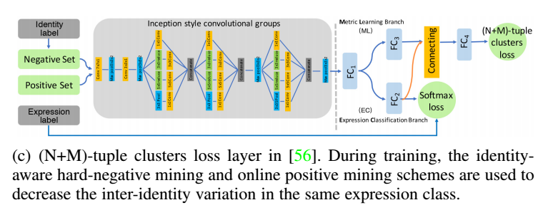 需要注意的一点是,Softmax在表情识别领域,不是很合适,毕竟表情的类间区分本来就不高,这也是难点所在,所以,用人脸识别模型中的改进损失如A-Softmax等效果比普通分类的Softmax普遍好。但是,个人觉得思路还是有问题。作者也整理了了几种针对表情分类的loss,如基于center loss 改进的ISLand loss(增加类间距离),LP Loss(locality-preserving,减小类内距离)。基于triplet loss改进的exponential triplet-based loss(网络中增加困难样本的权重),(N+M)-tupes cluster loss(降低anchor的选择难度,以及阈值化triplet不等式),如下图: